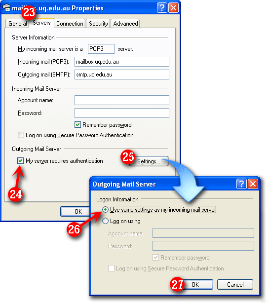 | 26)Ensure there is a dot next to 'Use the same settings as my incoming mail server' (this should be the default setting). |
